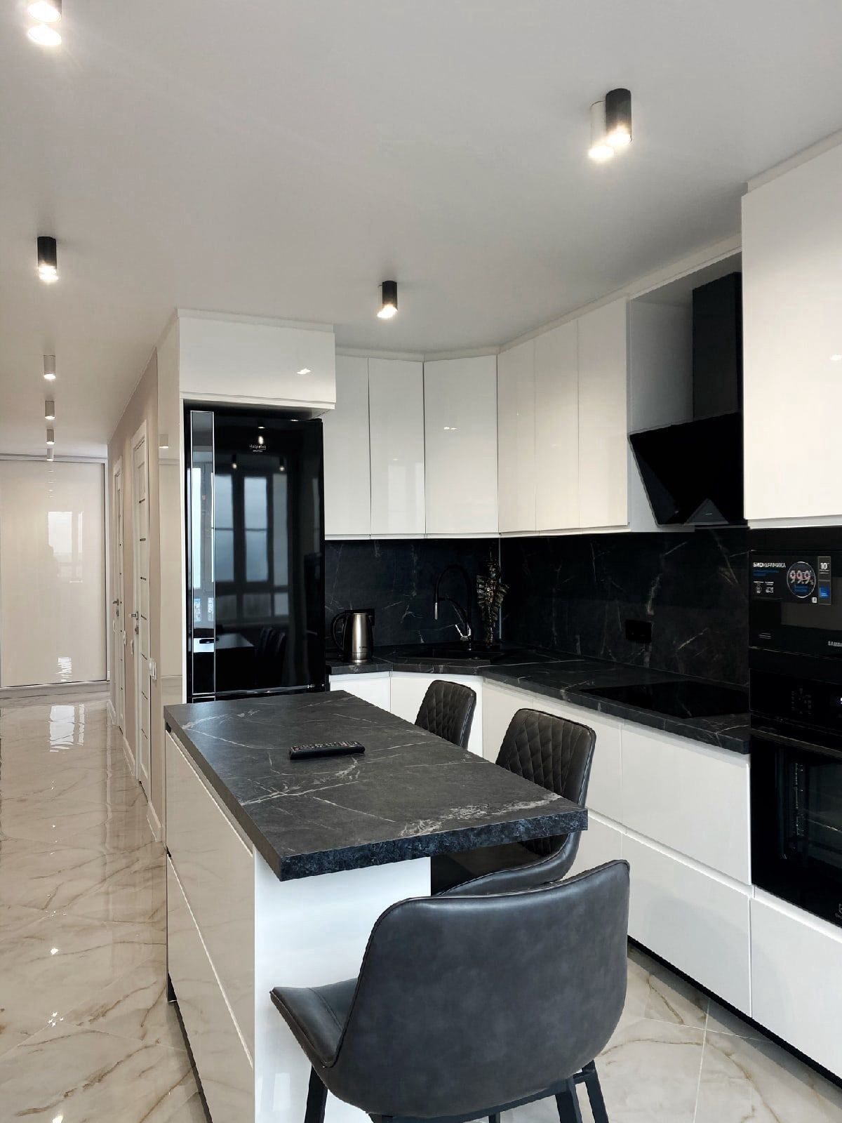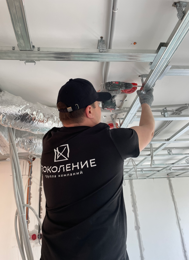 - Планировка и черновая отделка: Демонтаж, стяжка пола, монтаж гипсокартонного потолка с многоуровневыми конструкциями и декоративными нишами под освещение, выравнивание стен