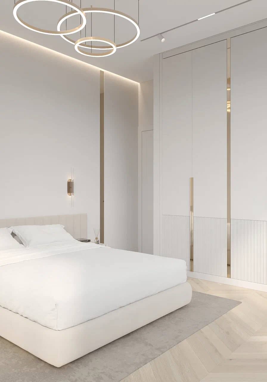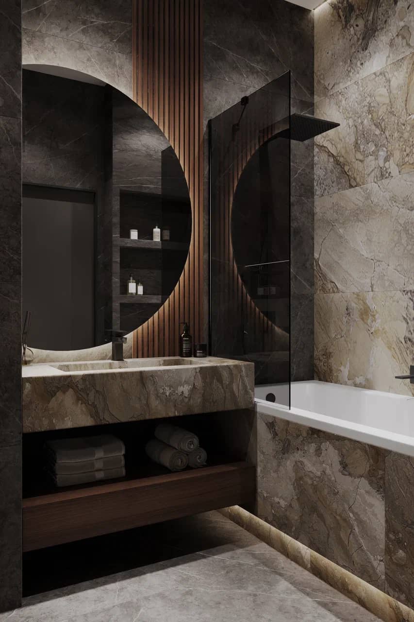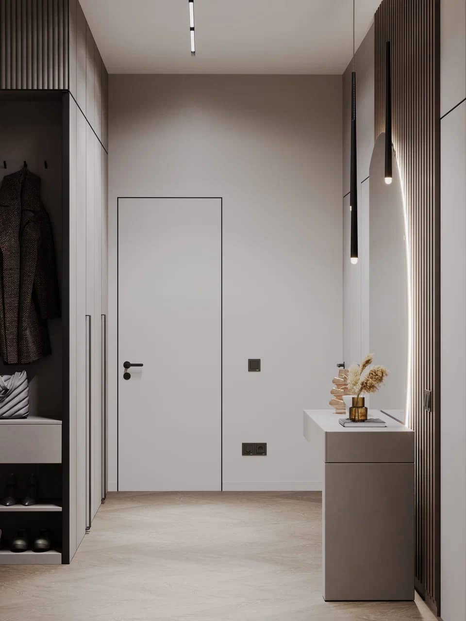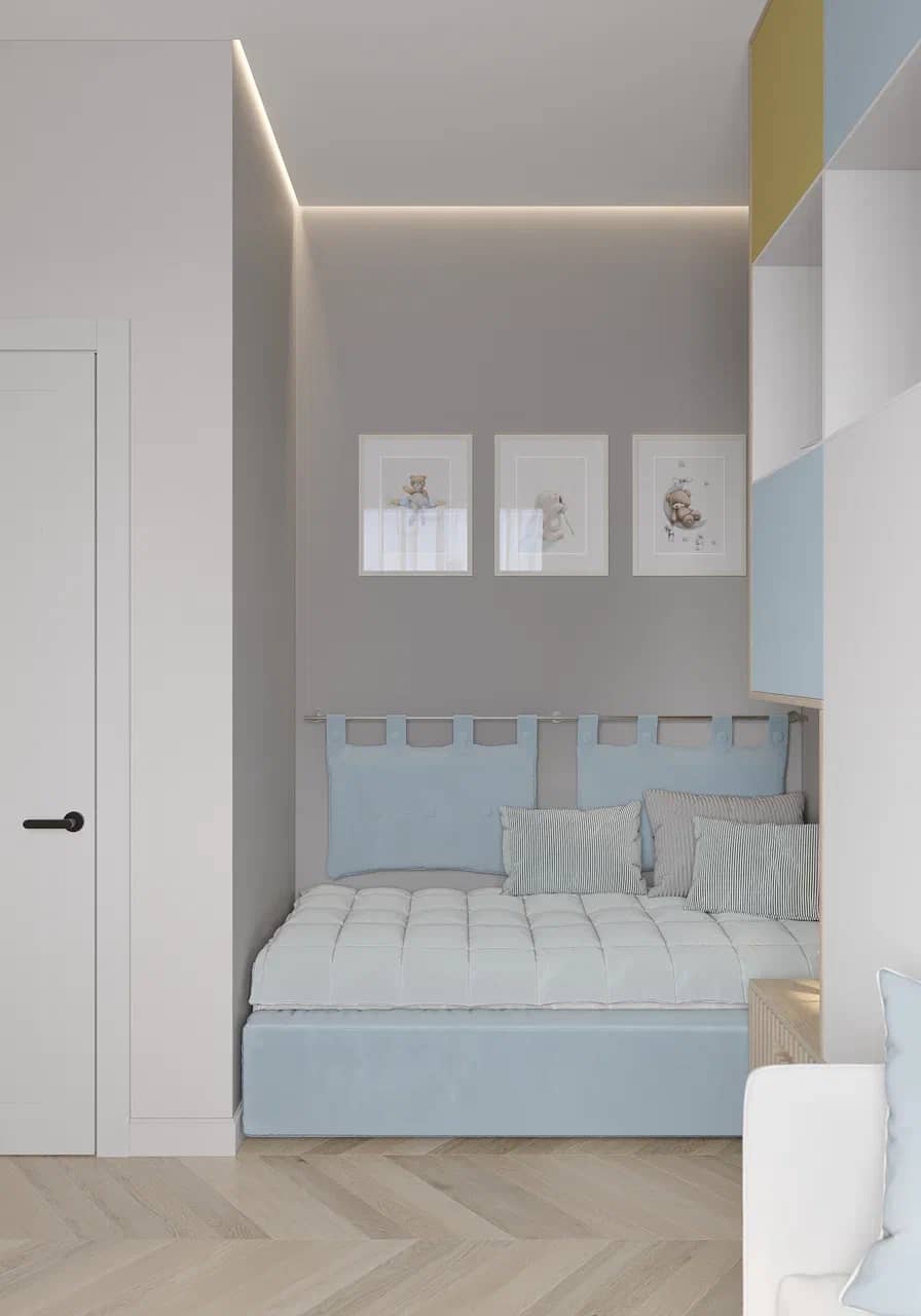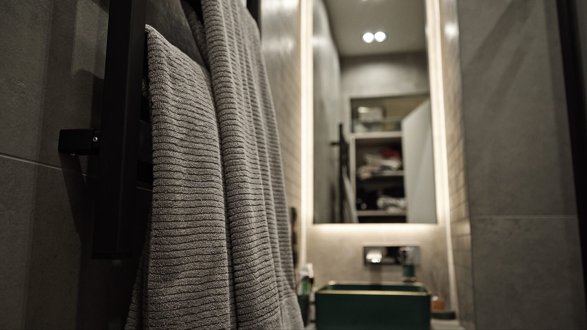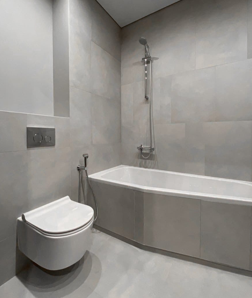 - Детали и дизайнерские решения: В ванной — комбинированная отделка плиткой и наливным полом с контрастной затиркой, в гостиной и спальне — декоративные профили и ниши для светильников, акцентная стена под покраску глубокого цвета, встроенные LED-подсветки в потолке.