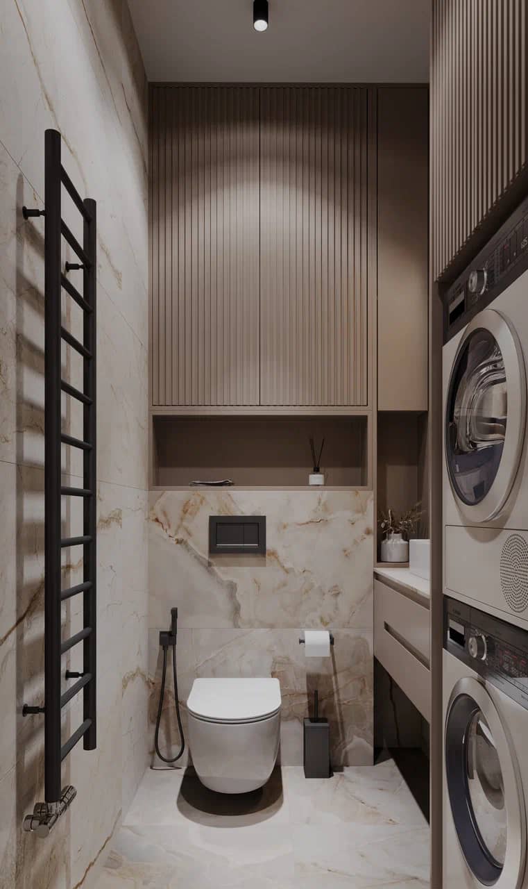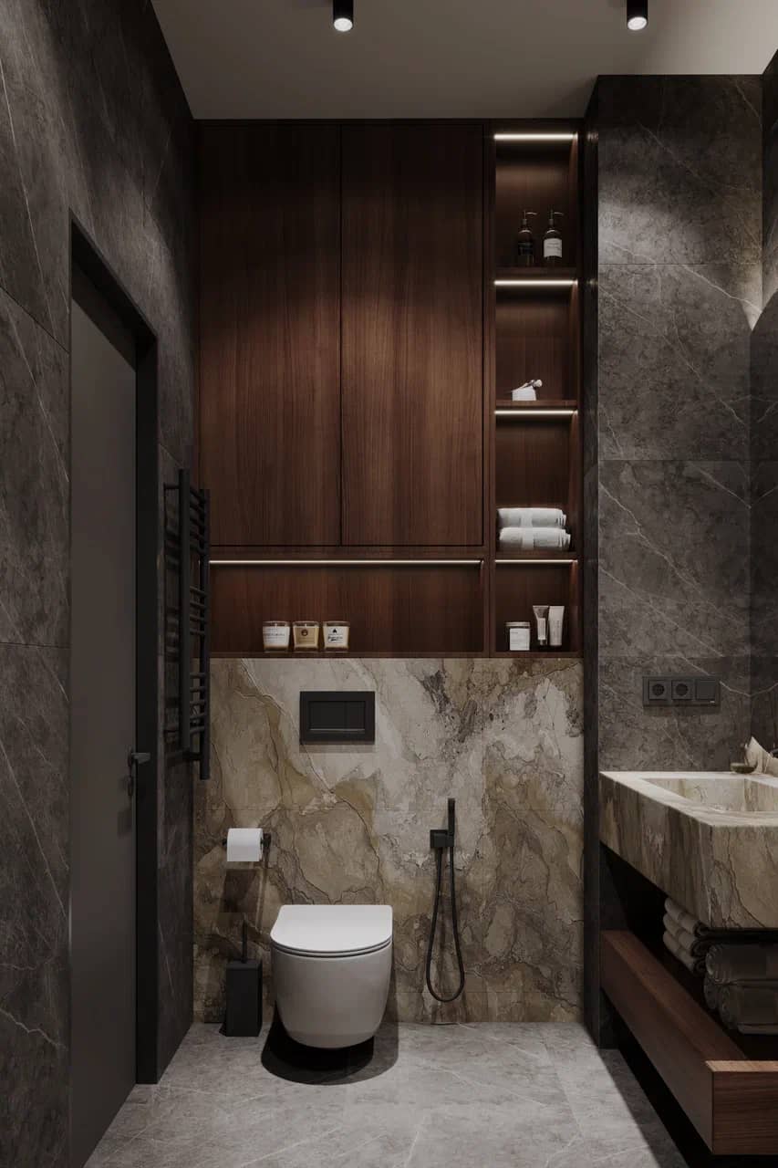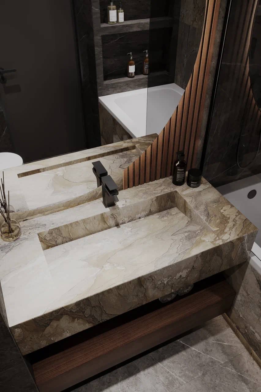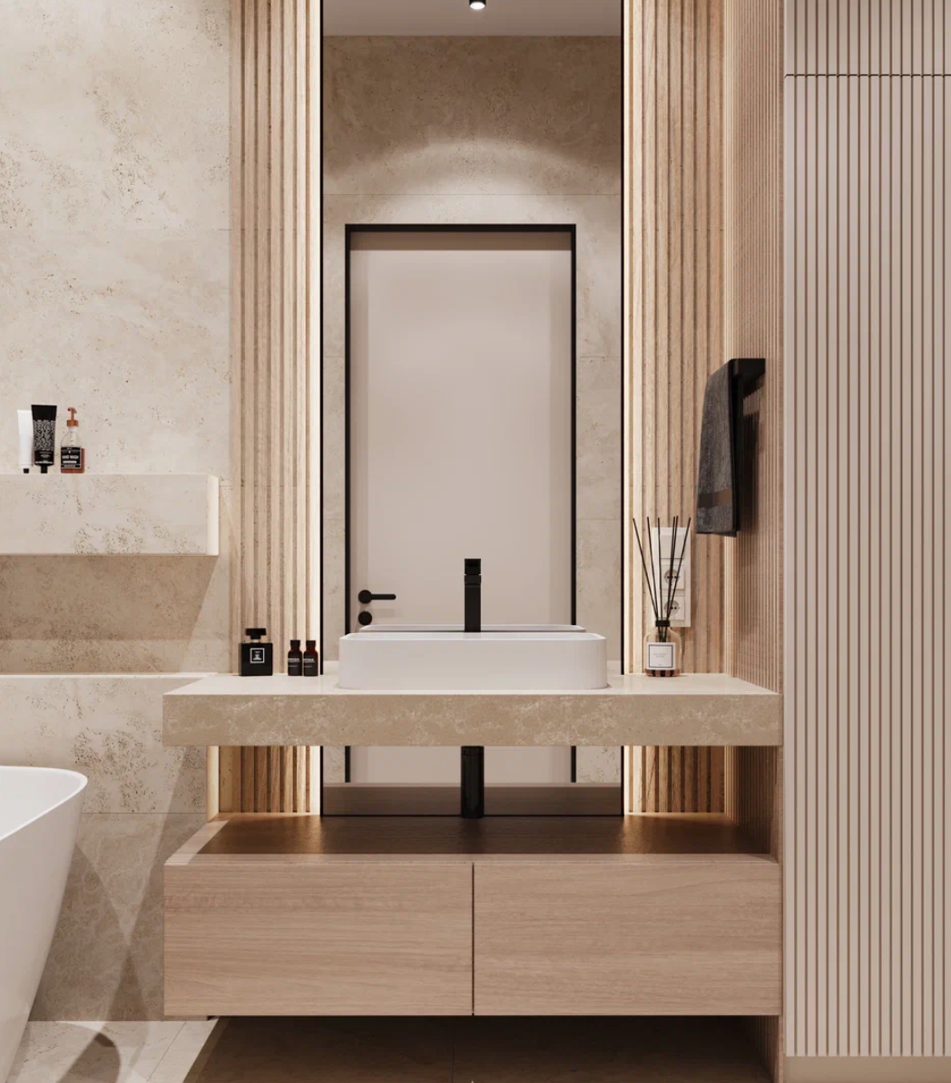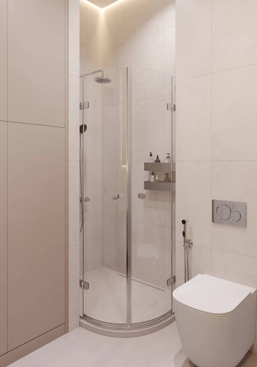 - Детали и дизайнерские решения: В ванной — комбинированная отделка плиткой и наливным полом с контрастной затиркой, в гостиной и спальне — декоративные профили и ниши для светильников, акцентная стена под покраску глубокого цвета, встроенные LED-подсветки в потолке.