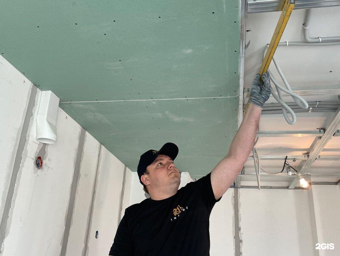 - Планировка и черновая отделка: монтаж многоуровневого гипсокартонного потолка с декоративными нишами, штукатурка стен и выравнивание под чистовую отделку.