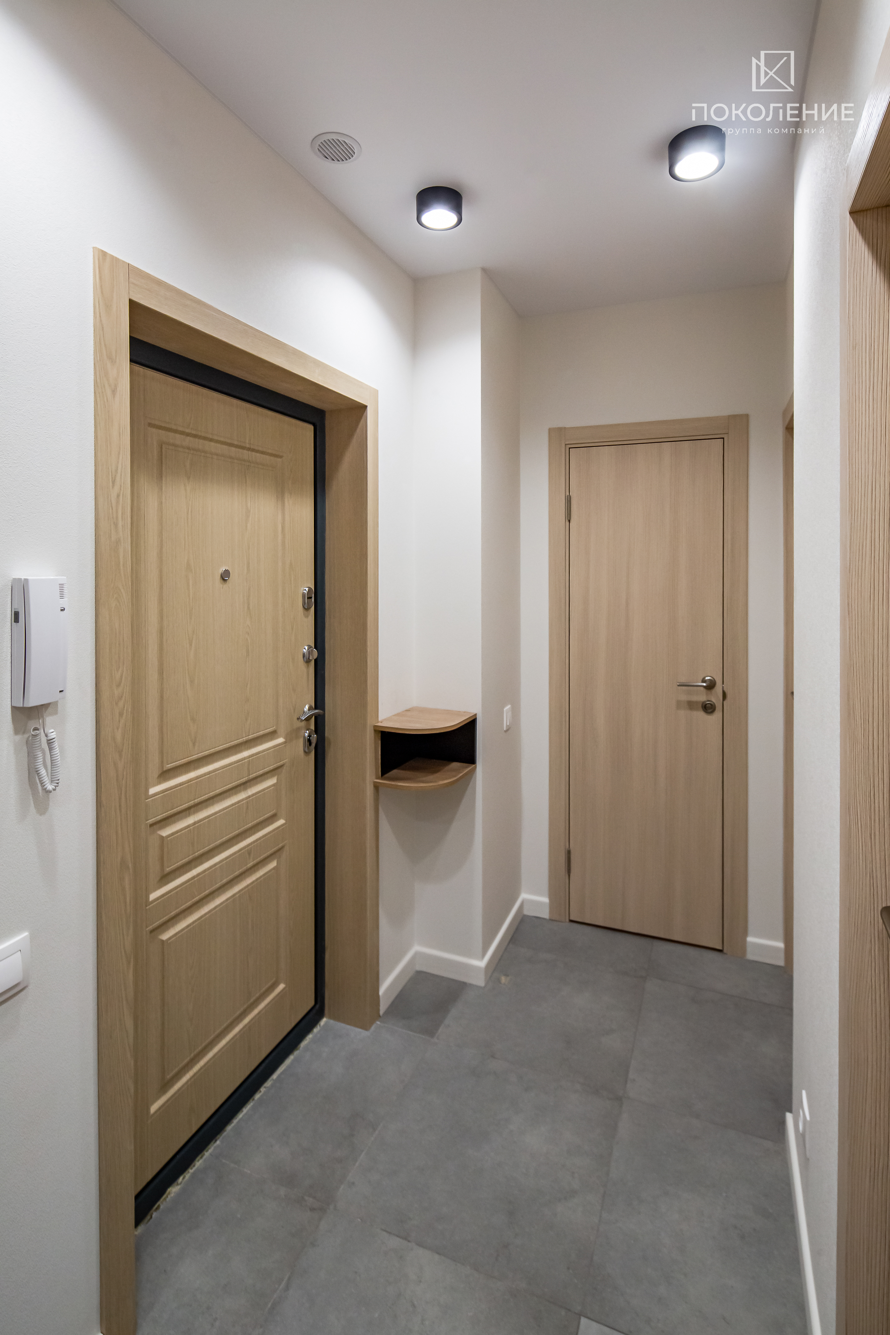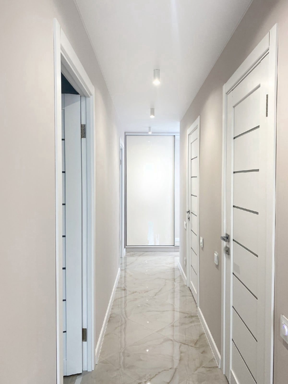 - Чистовая отделка: инженерная доска, укладка плитки, шпаклевка и окраска стен и потолков в светлые оттенки, установка межкомнатных дверей, монтаж точечного освещения, выключателей и розеток.