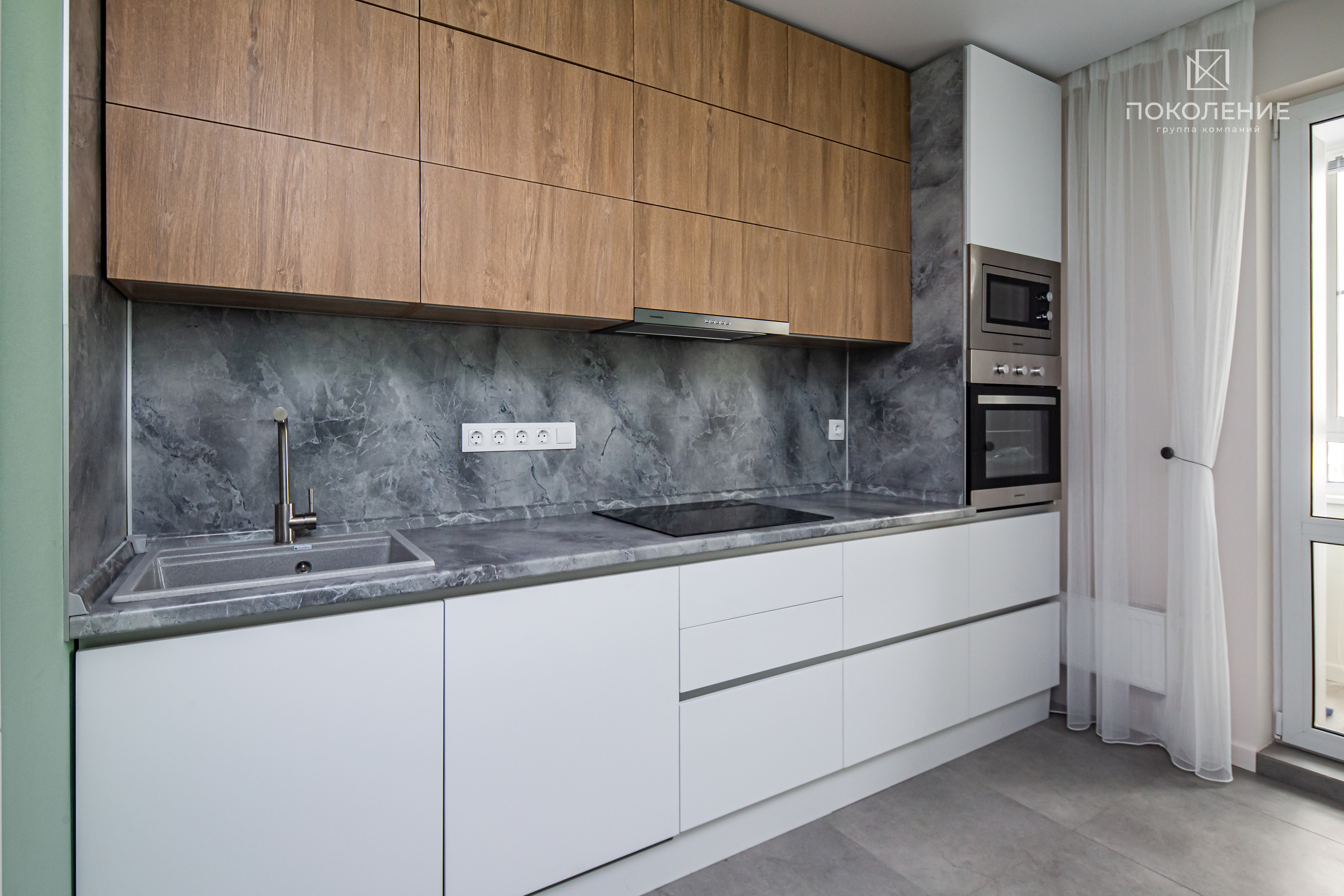 - Чистовая отделка: инженерная доска, керамогранит, наливной пол, шпаклевка и окраска стен и потолков, установка дверей, розеток, шкафов и кухонного гарнитура.